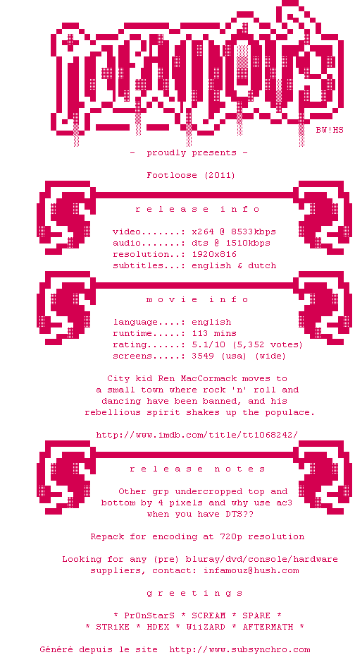 Voir le nfo de la release Footloose.2011.720p.BluRay.x264-iNFAMOUS