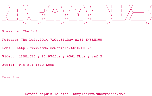 Voir le nfo de la release The.Loft.2014.720p.BluRay.x264-iNFAMOUS