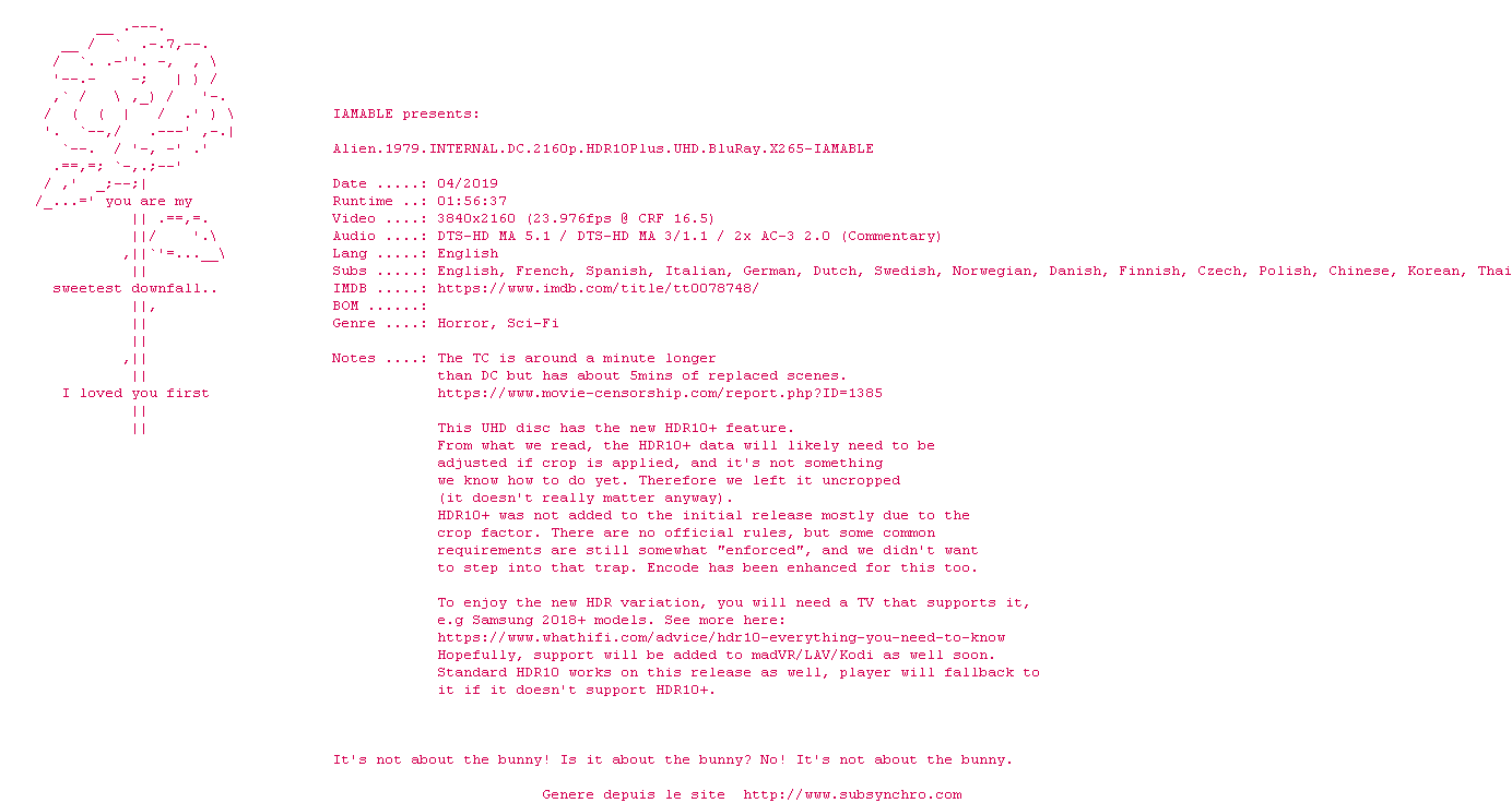 Voir le nfo de la release The.Shining.1980.iNTERNAL.HDR10Plus.2160p.UHD.BluRay.x265-IAMABLE