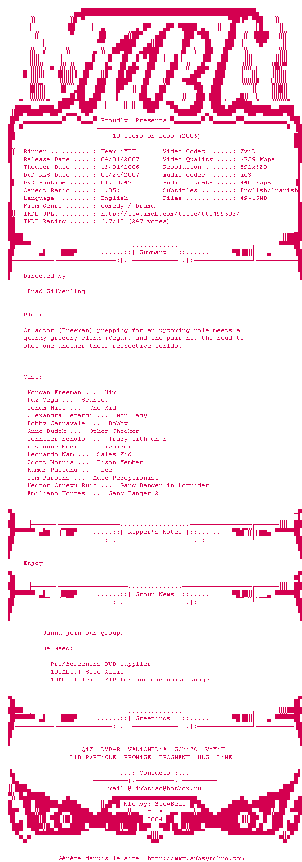 Voir le nfo de la release 10.Items.Or.Less.LIMITED.DVDRip.XViD-iMBT