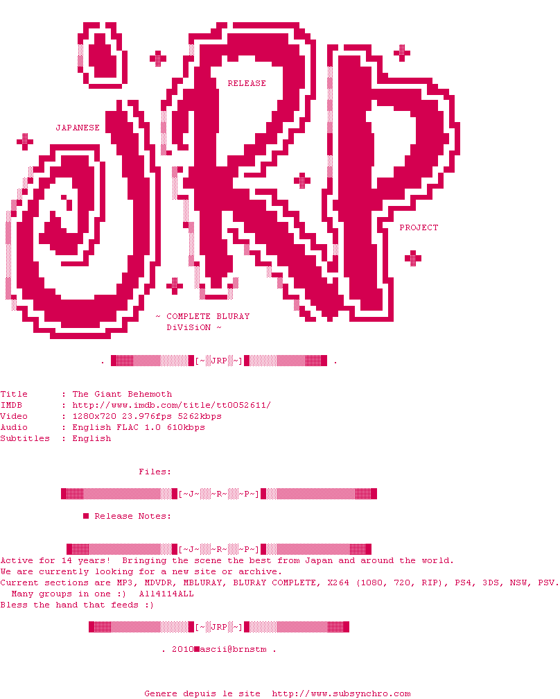 Voir le nfo de la release The.Giant.Behemoth.1959.iNTERNAL.BDRip.x264-JRP