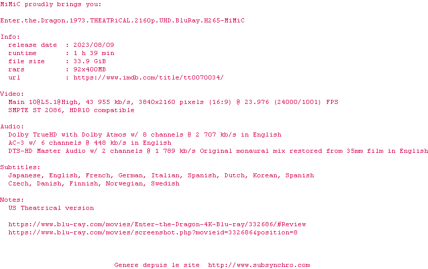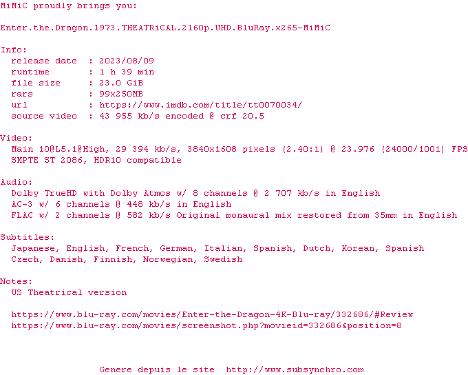 Voir le nfo de la release Enter.The.Dragon.1973.THEATRiCAL.2160p.UHD.BluRay.x265-MiMiC
