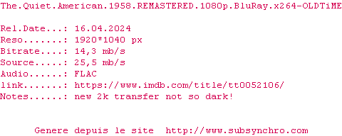 Voir le nfo de la release The.Quiet.American.1958.REMASTERED.1080p.BluRay.x264-OLDTiME