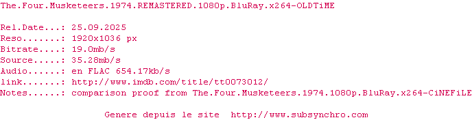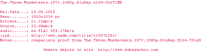 Voir le nfo de la release The.Three.Musketeers.1973.REMASTERED.1080p.BluRay.x264-OLDTiME