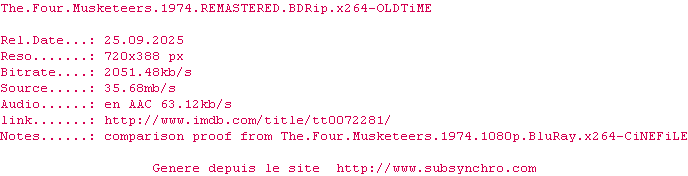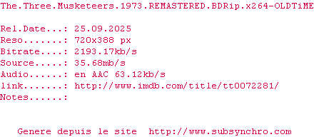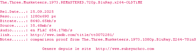 Voir le nfo de la release The.Three.Musketeers.1973.REMASTERED.720p.BluRay.x264-OLDTiME