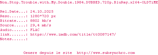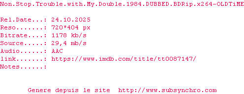 Voir le nfo de la release Non.Stop.Trouble.With.My.Double.1984.DUBBED.1080p.BluRay.x264-OLDTiME