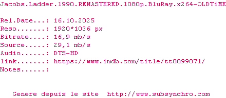 Voir le nfo de la release Jacobs.Ladder.1990.REMASTERED.1080p.BluRay.x264-OLDTiME