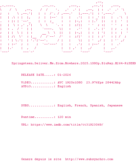 Voir le nfo de la release Springsteen.Deliver.Me.From.Nowhere.2025.1080p.BluRay.H264-RiSEHD