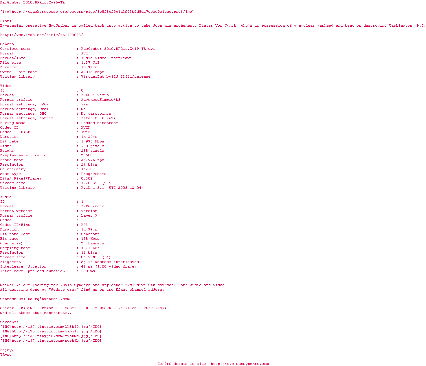 Voir le nfo de la release MacGruber.2010.BRRip.XviD-TA