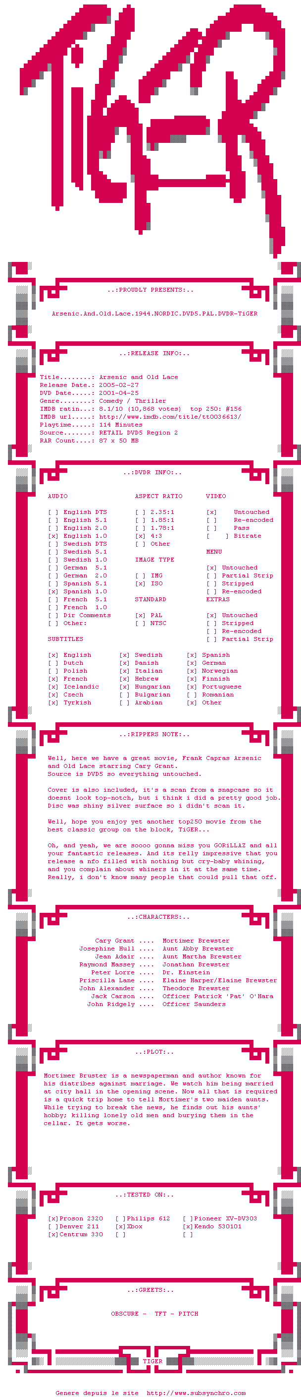 Voir le nfo de la release Arsenic.And.Old.Lace.1944.NORDIC.DVD5.PAL.DVDR-TiGER