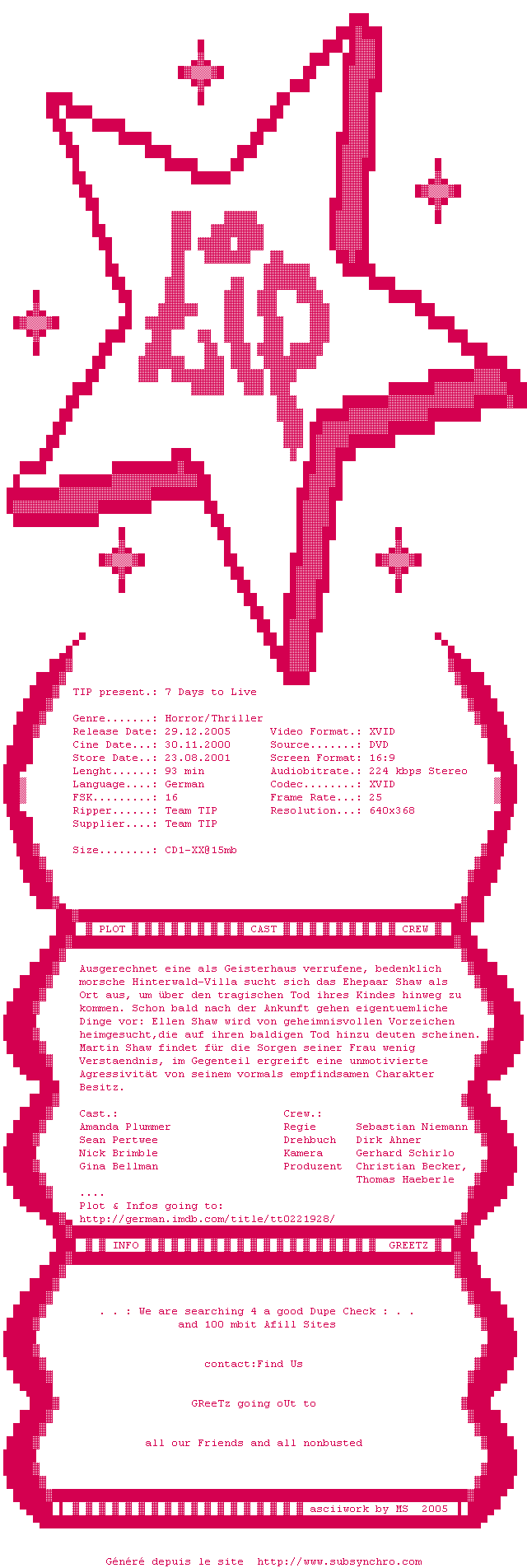 Voir le nfo de la release 7.Days.to.Live.German.2000.DVDRiP.XviD-TIP