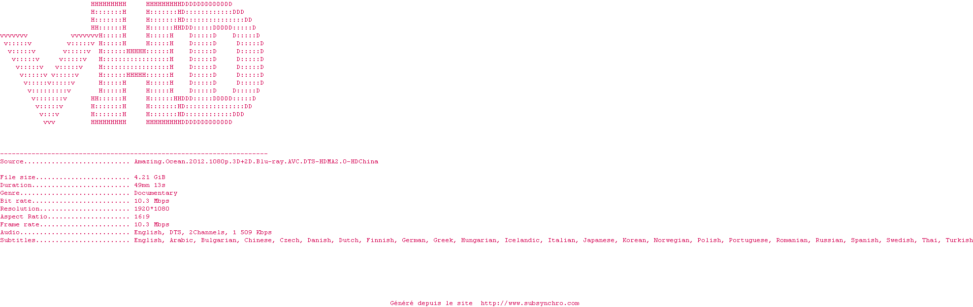 Voir le nfo de la release Amazing.Ocean.2012.Bluray.1080p.DTS2.0.x264-vHD