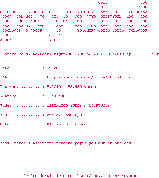 Voir le nfo de la release Transformers.The.Last.Knight.2017.REPACK.3D.1080p.BluRay.x264-PSYCHD
