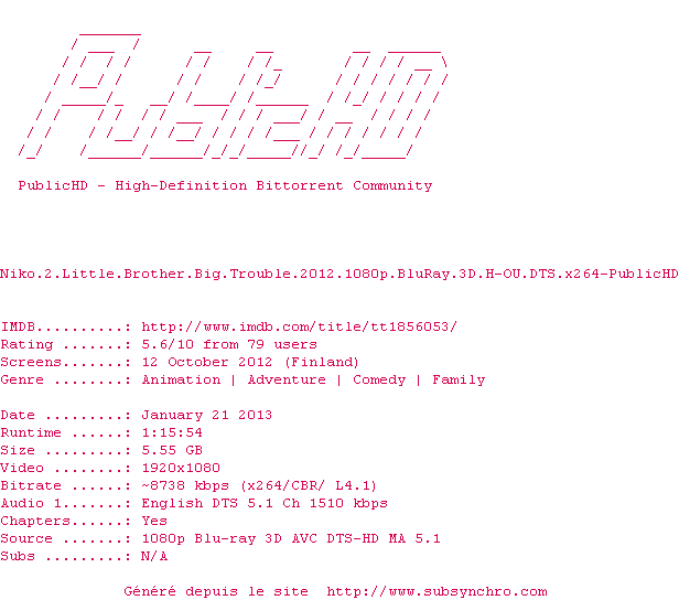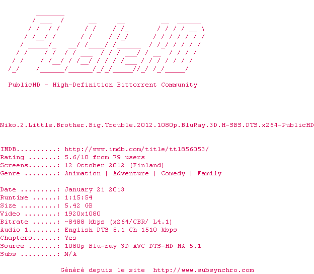 Voir le nfo de la release Niko.2.Little.Brother.Big.Trouble.2012.1080p.BluRay.3D.H-SBS.DTS.x264-PublicHD