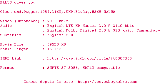 Voir le nfo de la release Cloak.And.Dagger.1984.2160p.UHD.BluRay.H265-MALUS