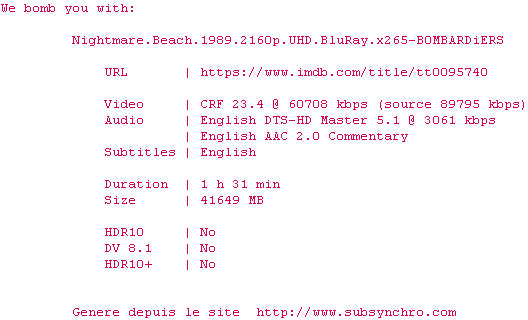 Voir le nfo de la release Absurd.1981.EXTENDED.DUBBED.2160P.UHD.BLURAY.x265-WATCHABLE