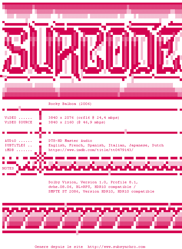 Voir le nfo de la release Rocky.Balboa.2006.DC.2160p.UHD.BluRay.x265-SURCODE