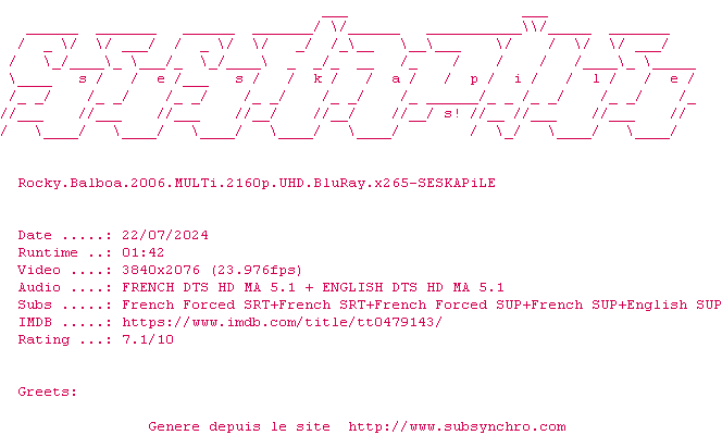 Voir le nfo de la release Rocky.Balboa.2006.MULTi.2160p.UHD.BluRay.x265-SESKAPiLE
