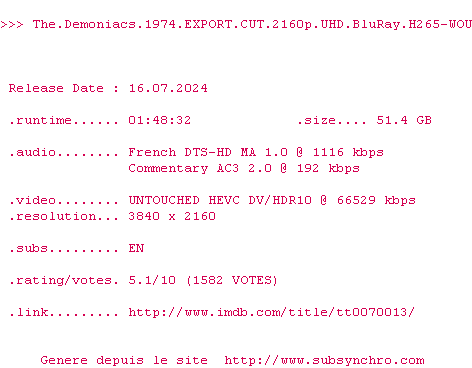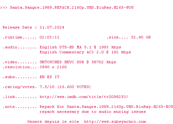 Voir le nfo de la release Santa.Sangre.1989.REPACK.2160p.UHD.BluRay.H265-WOU