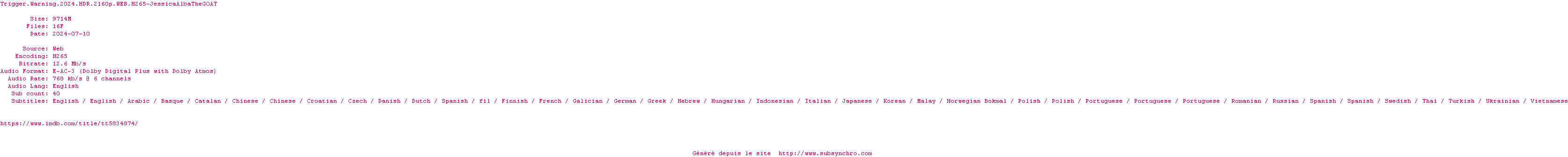 Voir le nfo de la release Trigger.Warning.2024.HDR.2160p.WEB.H265-JessicaAlbaTheGOAT