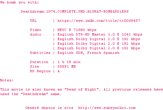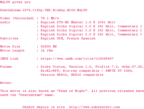 Voir le nfo de la release I.Spit.On.Your.Grave.1978.2160p.UHD.BluRay.H265-MALUS