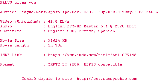 Voir le nfo de la release Justice.League.Dark.Apokolips.War.2020.2160p.UHD.BluRay.H265-MALUS