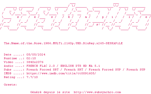 Voir le nfo de la release The.Name.Of.The.Rose.1986.MULTi.2160p.UHD.BluRay.x265-SESKAPiLE