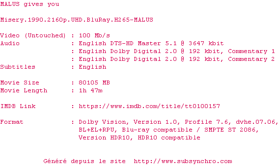Voir le nfo de la release Misery.1990.2160p.UHD.BluRay.H265-MALUS