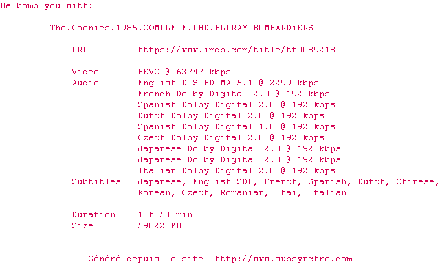 Voir le nfo de la release The.Goonies.1985.2160p.UHD.BluRay.x265-B0MBARDiERS