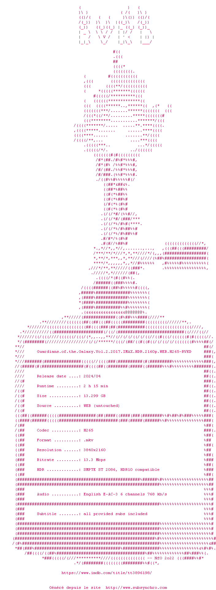 Voir le nfo de la release Guardians.Of.The.Galaxy.Vol.2.2017.IMAX.HDR.2160p.WEB.H265-RVKD