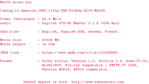Voir le nfo de la release Coming.To.America.1988.2160p.UHD.BluRay.H265-MALUS