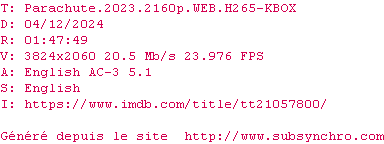Voir le nfo de la release Parachute.2023.2160p.WEB.H265-KBOX