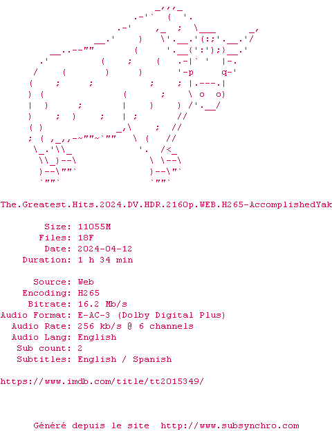 Voir le nfo de la release The.Greatest.Hits.2024.DV.HDR.2160p.WEB.H265-AccomplishedYak
