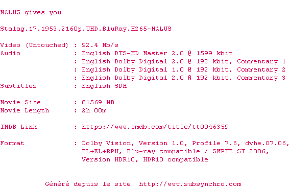 Voir le nfo de la release Stalag.17.1953.2160p.UHD.BluRay.H265-MALUS