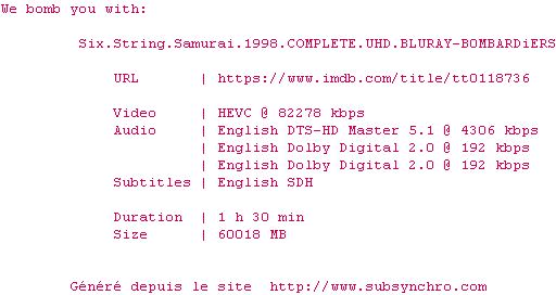 Voir le nfo de la release Six.String.Samurai.1998.COMPLETE.UHD.BLURAY-B0MBARDiERS