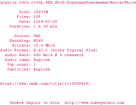 Voir le nfo de la release Argylle.2024.2160p.WEB.H265-SupermanPeacemakerWalterWhite