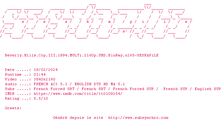 Voir le nfo de la release Beverly.Hills.Cop.III.1994.MULTi.2160p.UHD.BluRay.x265-SESKAPiLE