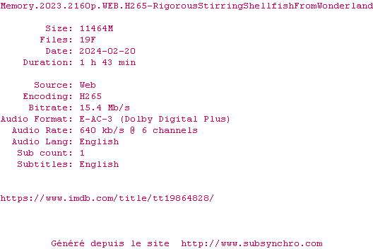 Voir le nfo de la release Memory.2023.2160p.WEB.H265-RigorousStirringShellfishFromWonderland