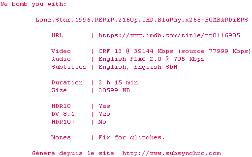 Voir le nfo de la release Lone.Star.1996.RERiP.2160p.UHD.BluRay.x265-B0MBARDiERS