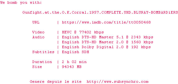 Voir le nfo de la release Gunfight.At.The.O.K.Corral.1957.COMPLETE.UHD.BLURAY-B0MBARDiERS