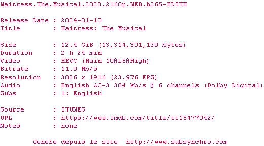 Voir le nfo de la release Waitress.The.Musical.2023.2160p.WEB.H265-EDITH