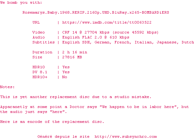 La release Rosemarys.Baby.1968.REPACK.COMPLETE.UHD.BLURAY-OPTiCAL est en 4K