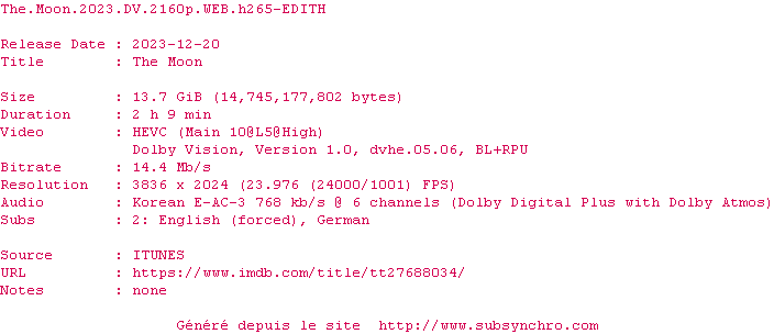 Voir le nfo de la release The.Moon.2023.HDR.2160p.WEB.H265-EDITH