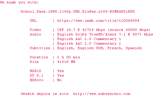 Voir le nfo de la release School.Daze.1988.2160p.UHD.BluRay.x265-B0MBARDiERS