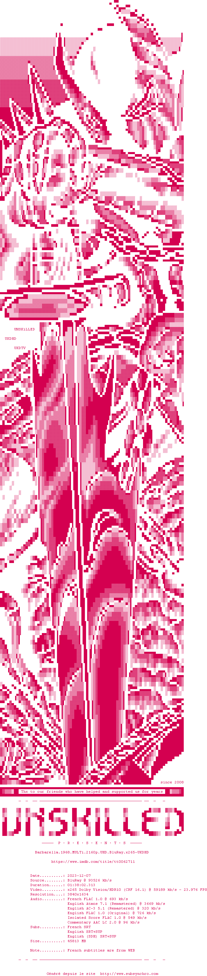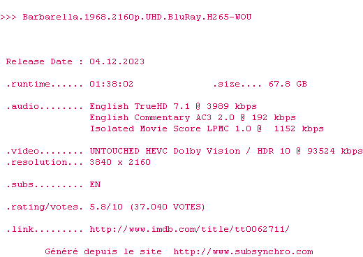 Voir le nfo de la release Barbarella.1968.2160p.UHD.BluRay.H265-WOU