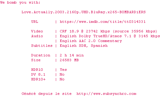 Voir le nfo de la release Love.Actually.2003.2160p.UHD.BluRay.x265-B0MBARDiERS
