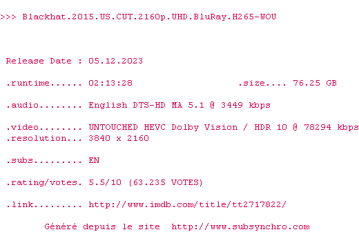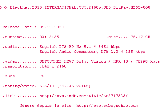 Voir le nfo de la release Blackhat.2015.US.CUT.2160p.UHD.BluRay.H265-WOU