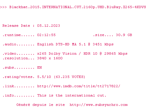 La release Blackhat.2015.INTERNATIONAL.CUT.2160p.UHD.BluRay.H265-4KDVS est en 4K