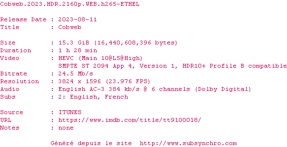 Voir le nfo de la release Cobweb.2023.HDR.2160p.WEB.H265-ETHEL