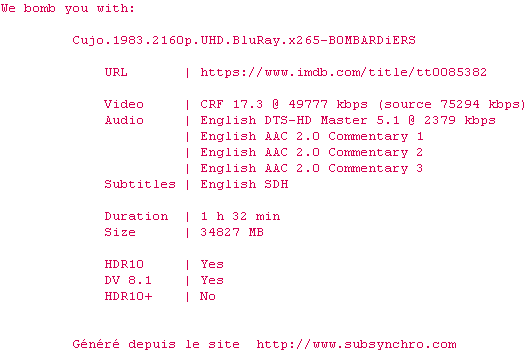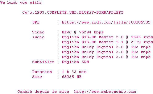 Voir le nfo de la release Cujo.1983.2160p.UHD.BluRay.x265-B0MBARDiERS